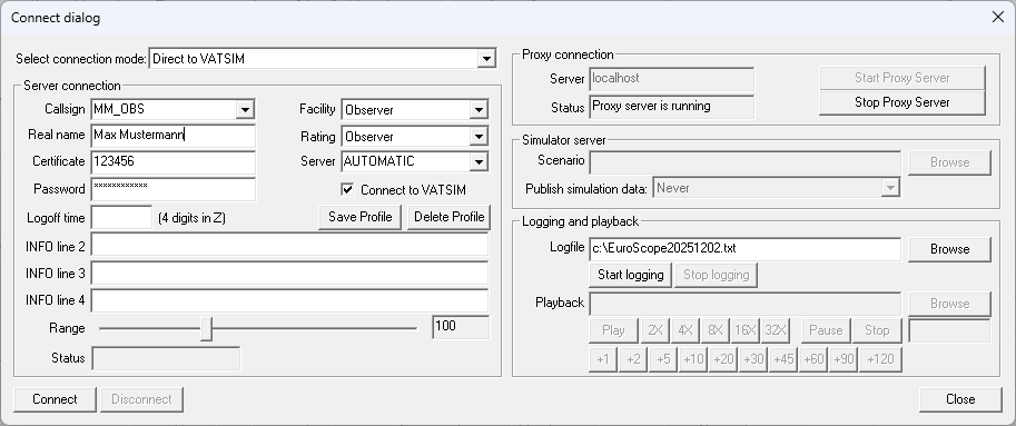 You can always login as observer (OBS) with an active VATSIM account (i.e. you have completed the New Member Orientation and are not subject to a suspension). Open your profile of choice and click on "Connect" atin the upper left corner.corner Asof Callsignthe weEuroScope suggestwindow. toYou usewill see the "Connect dialog":