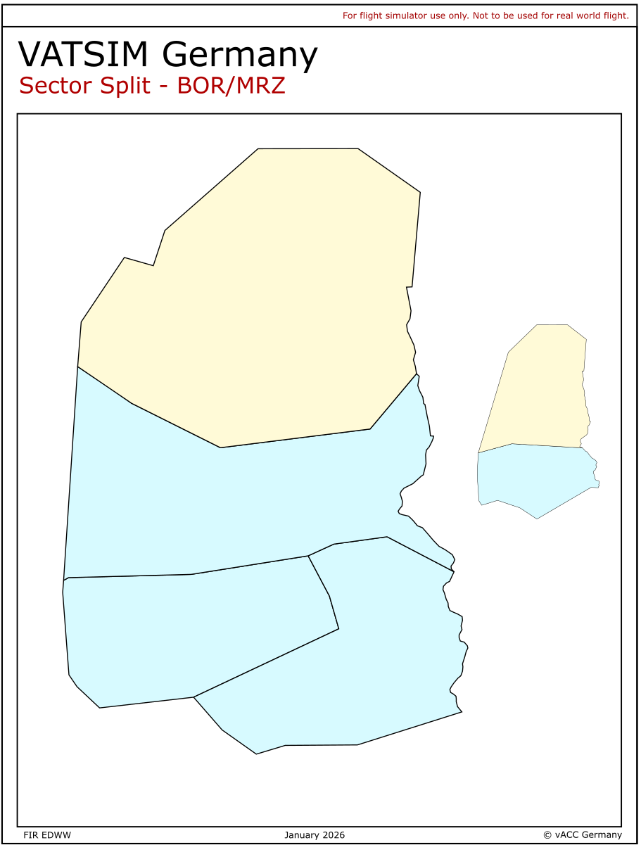 There are many options available to allow the splitting of Bremen's sector group East. In general, sector ownership is determined according to the definitions in the sectorfile. Dynamic splitting is not available in Euroscope/Topsky.