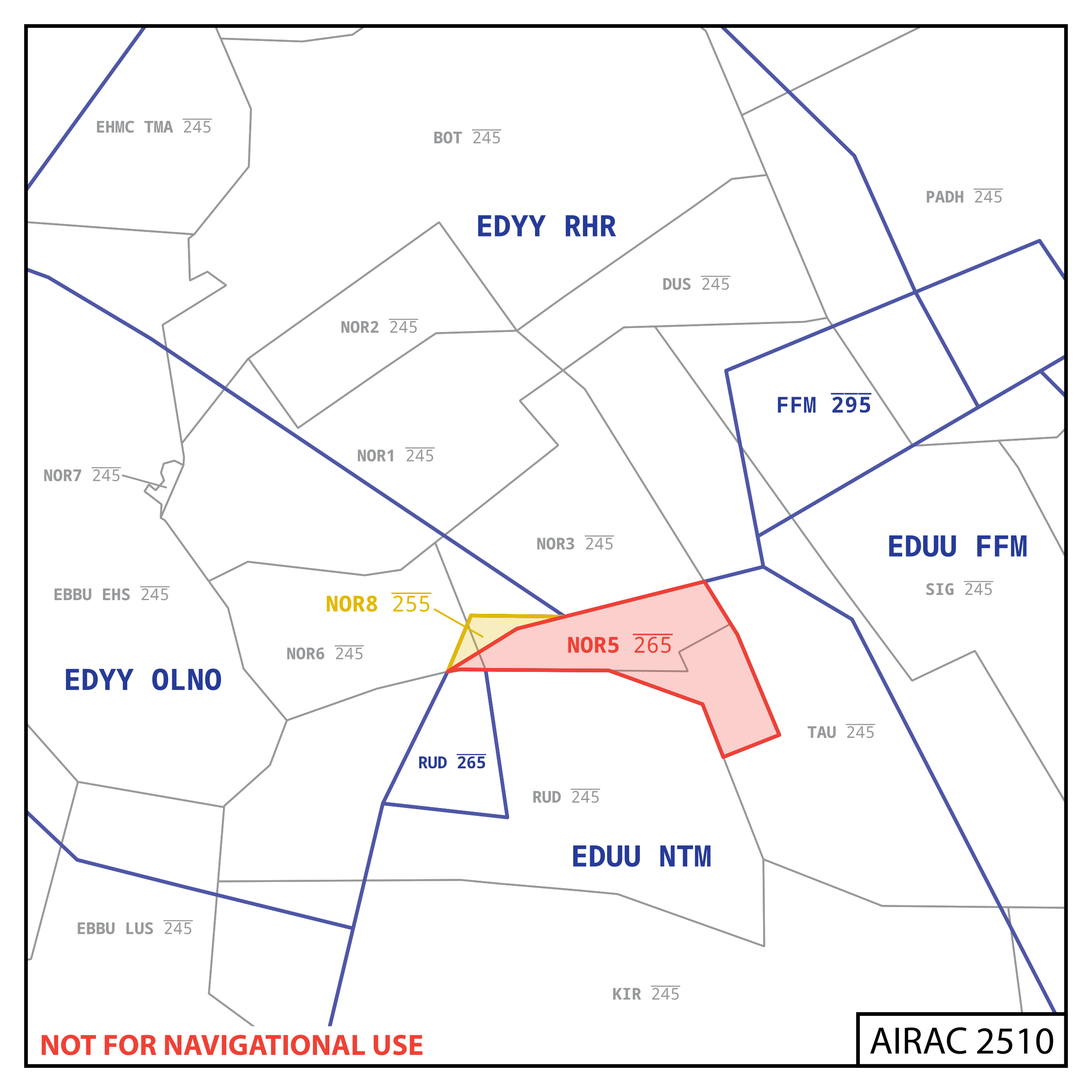 The red area shown below reaches up to FL265 and is delegated airspace of EDUU sector Nattenheim. It therefore boarders to MUAC Sectors Ruhr & Olno. The yellow part reaches up to FL255 and is delegated by EDYY Olno.