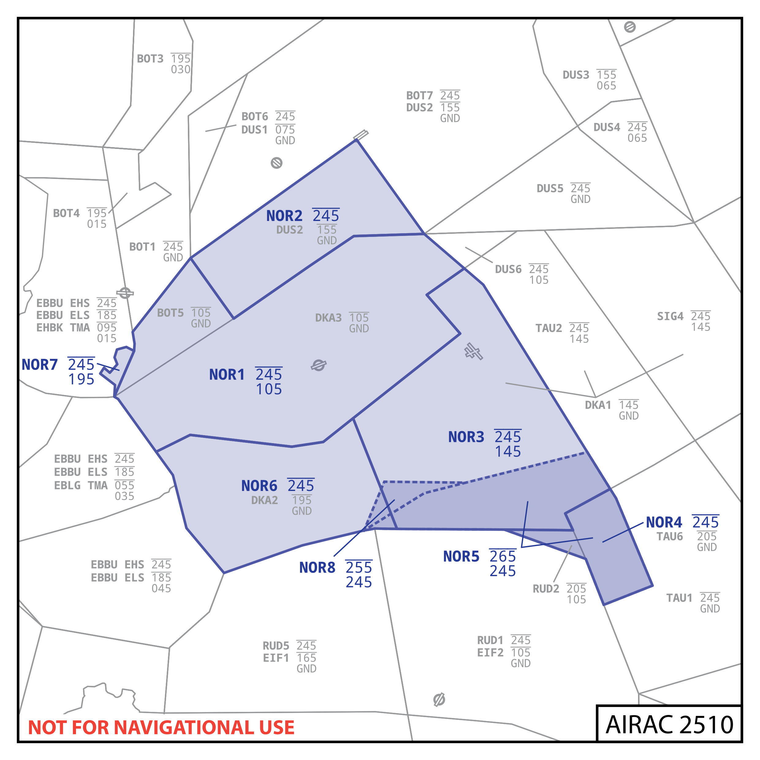 Langen Sector Nörvenich NOR is located west of the airport above sector DKA and is primarily responsible for the pre-sequencing of inbound flights to Düsseldorf from IBESA via ELDAR and BIKMU. In addition, the sector is responsible for all departures from Cologne to Belgium via NVO.